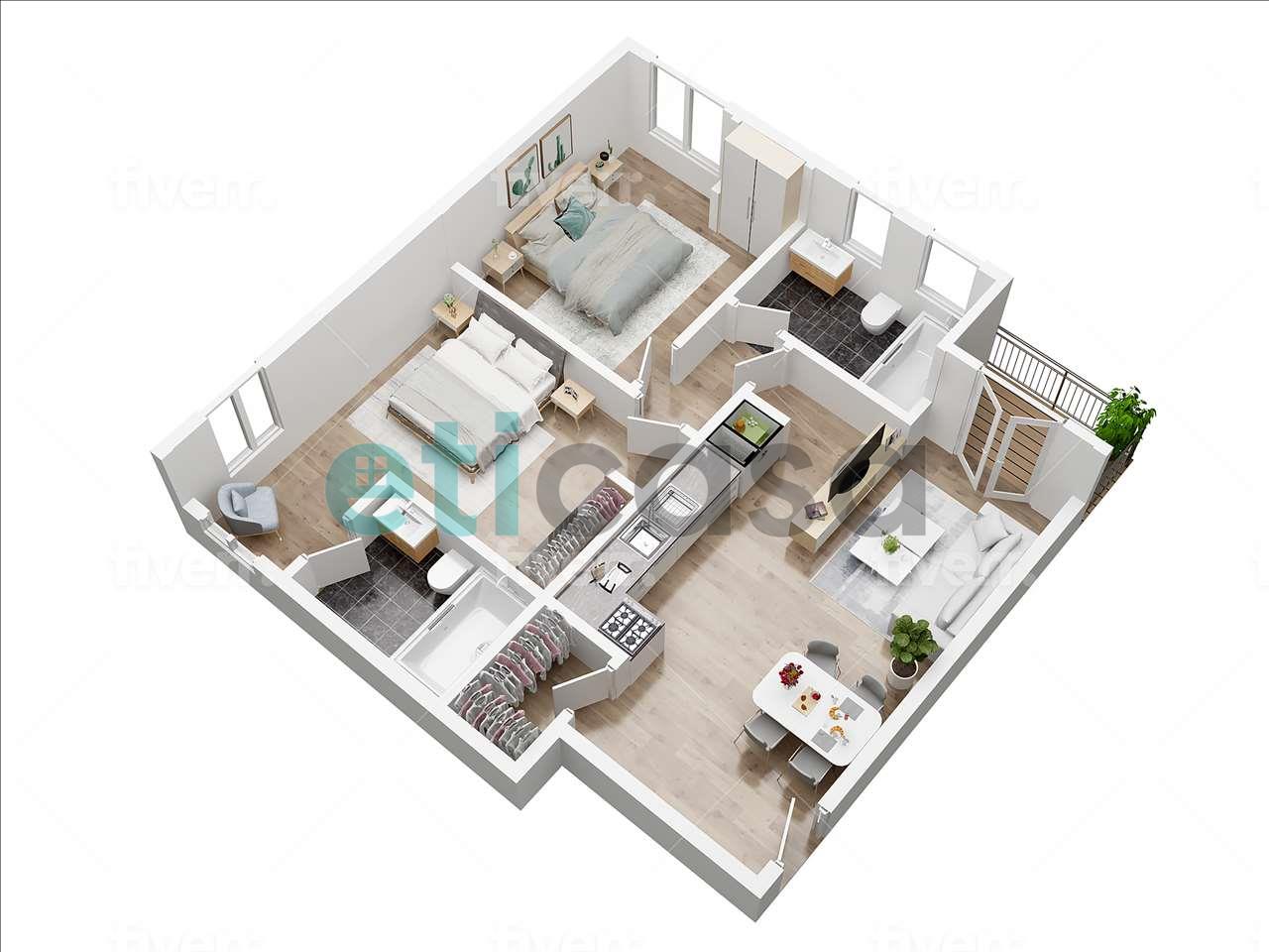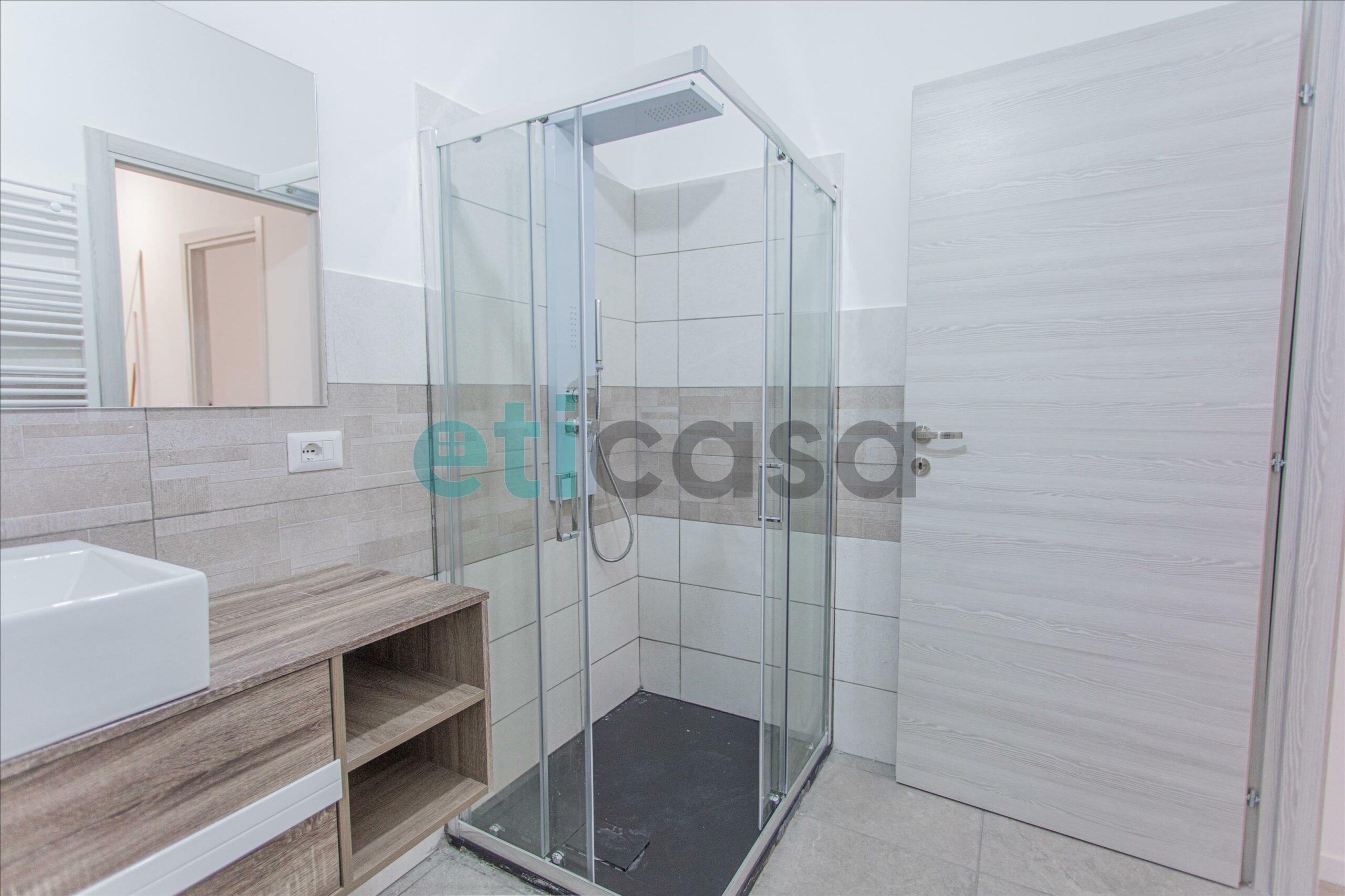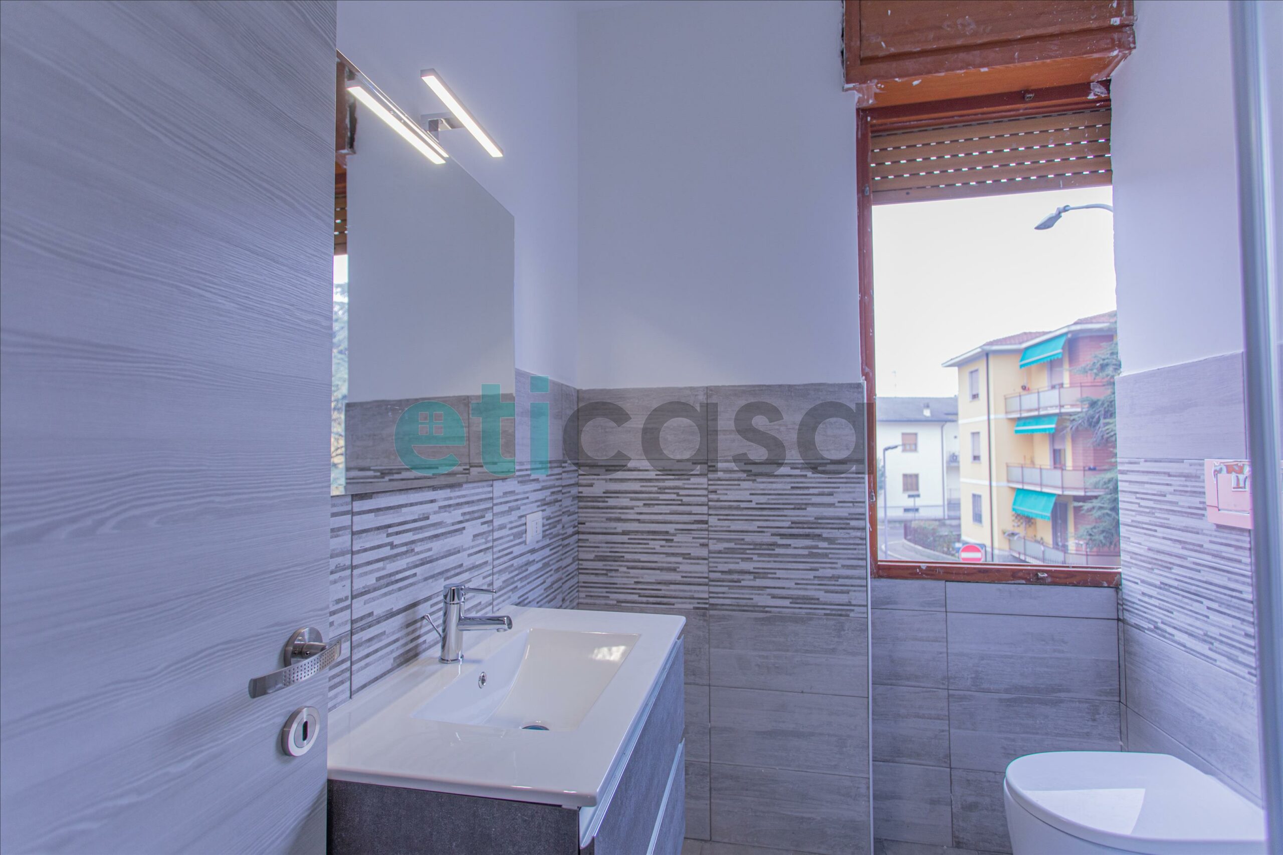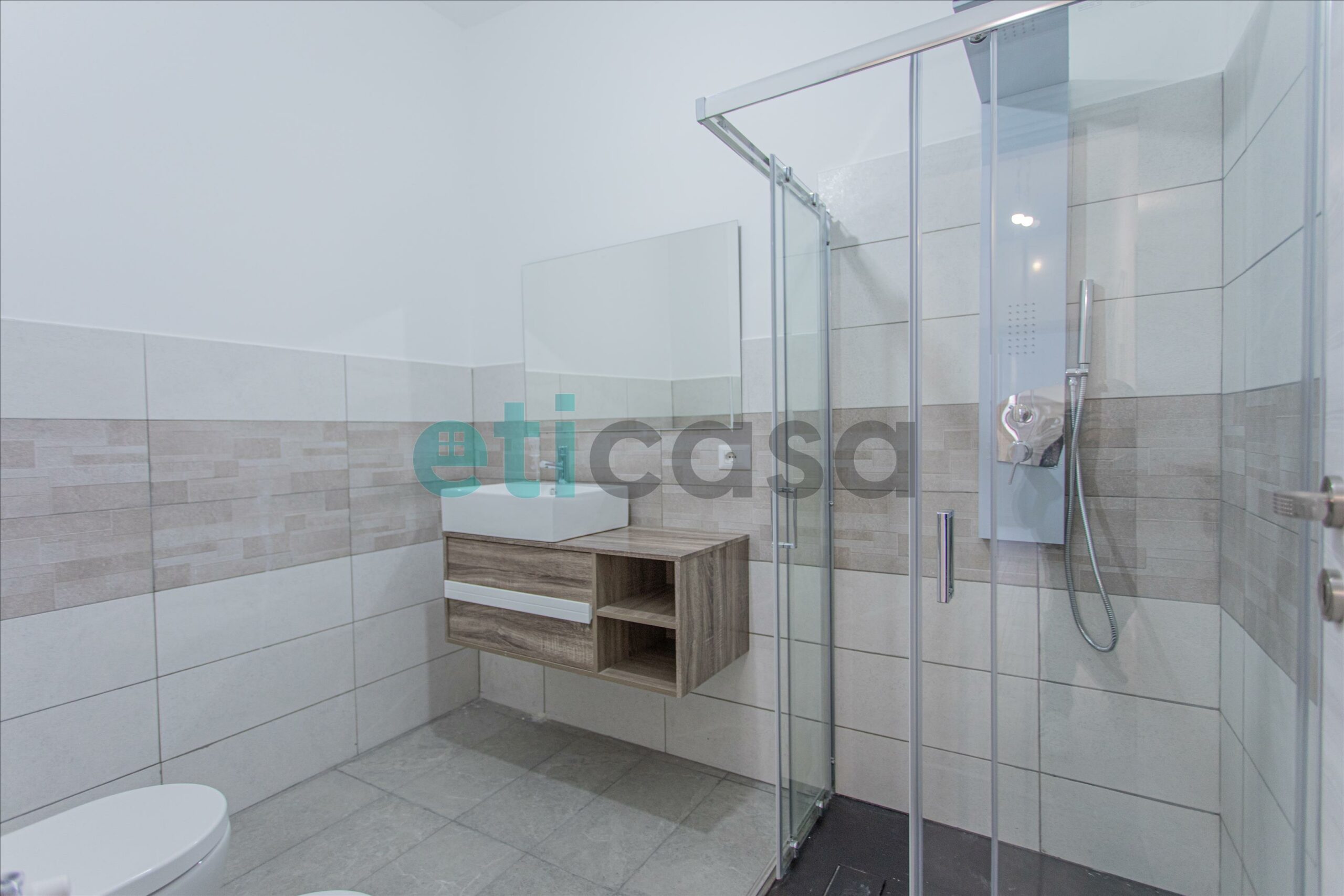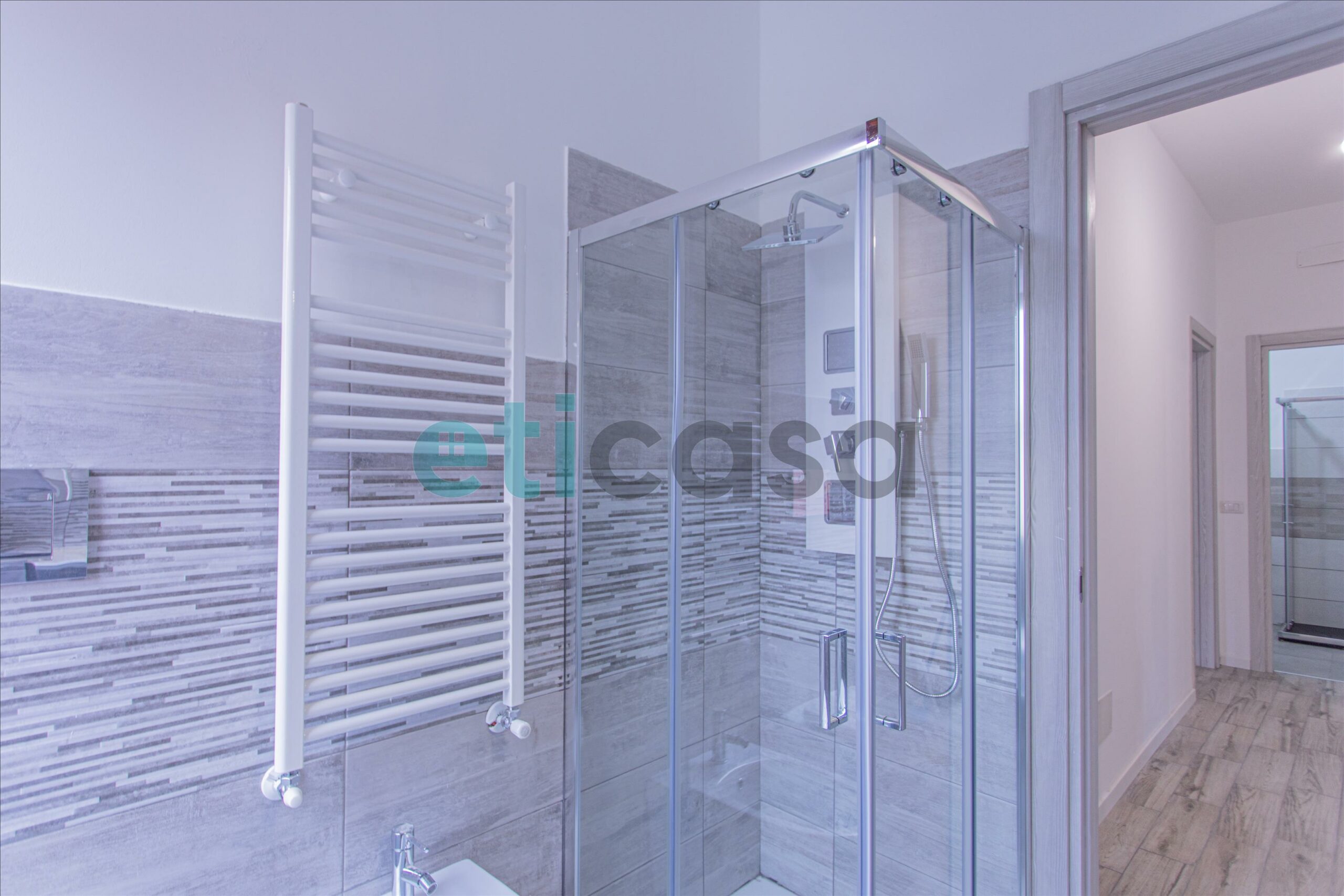 Accedendo alla seconda parte dell’abitazione troviamo due bagni, di cui uno con ampia finestra, completi di sanitari e box doccia.