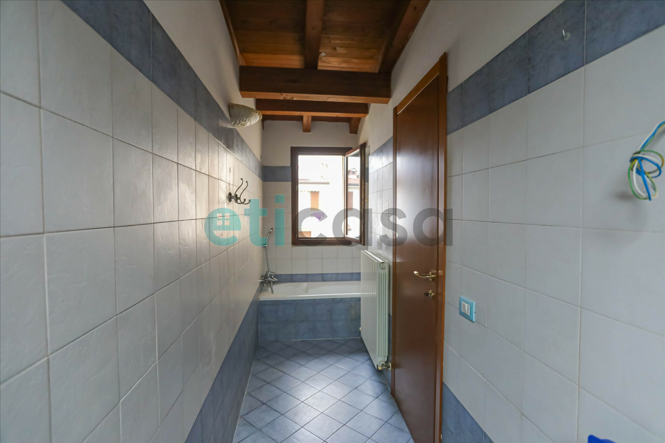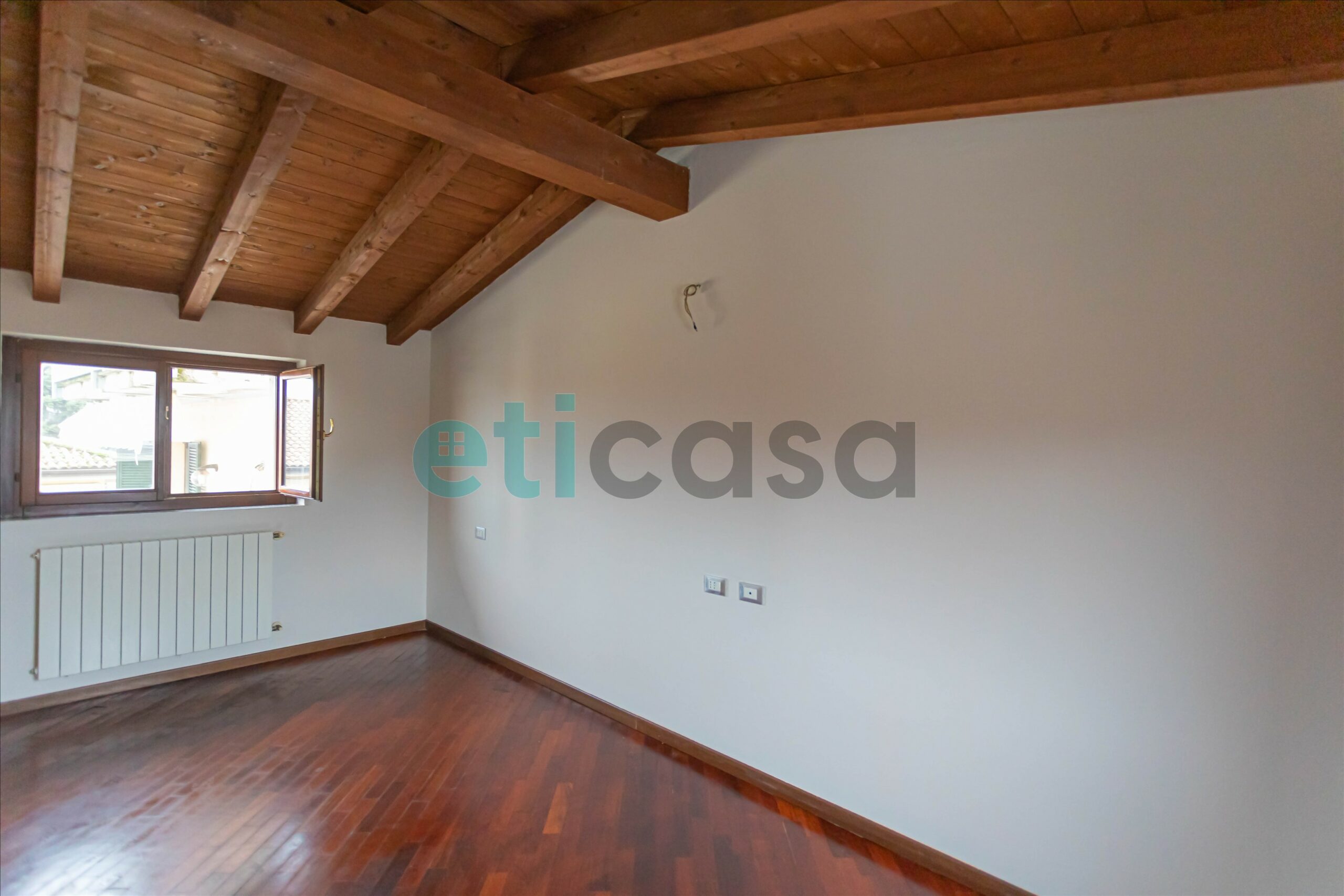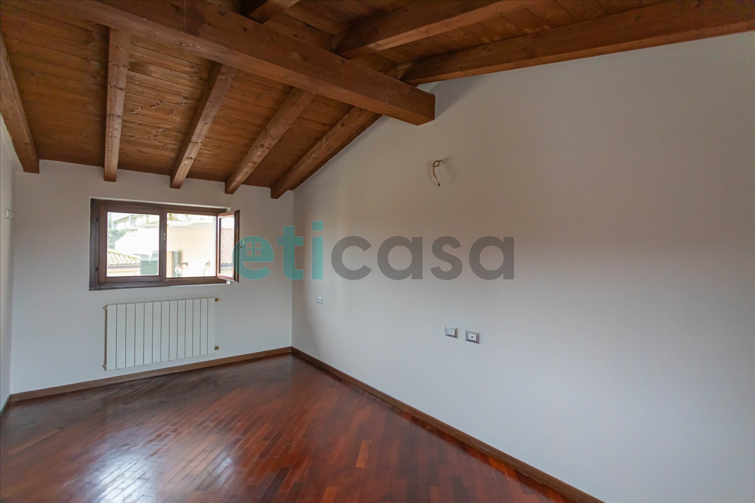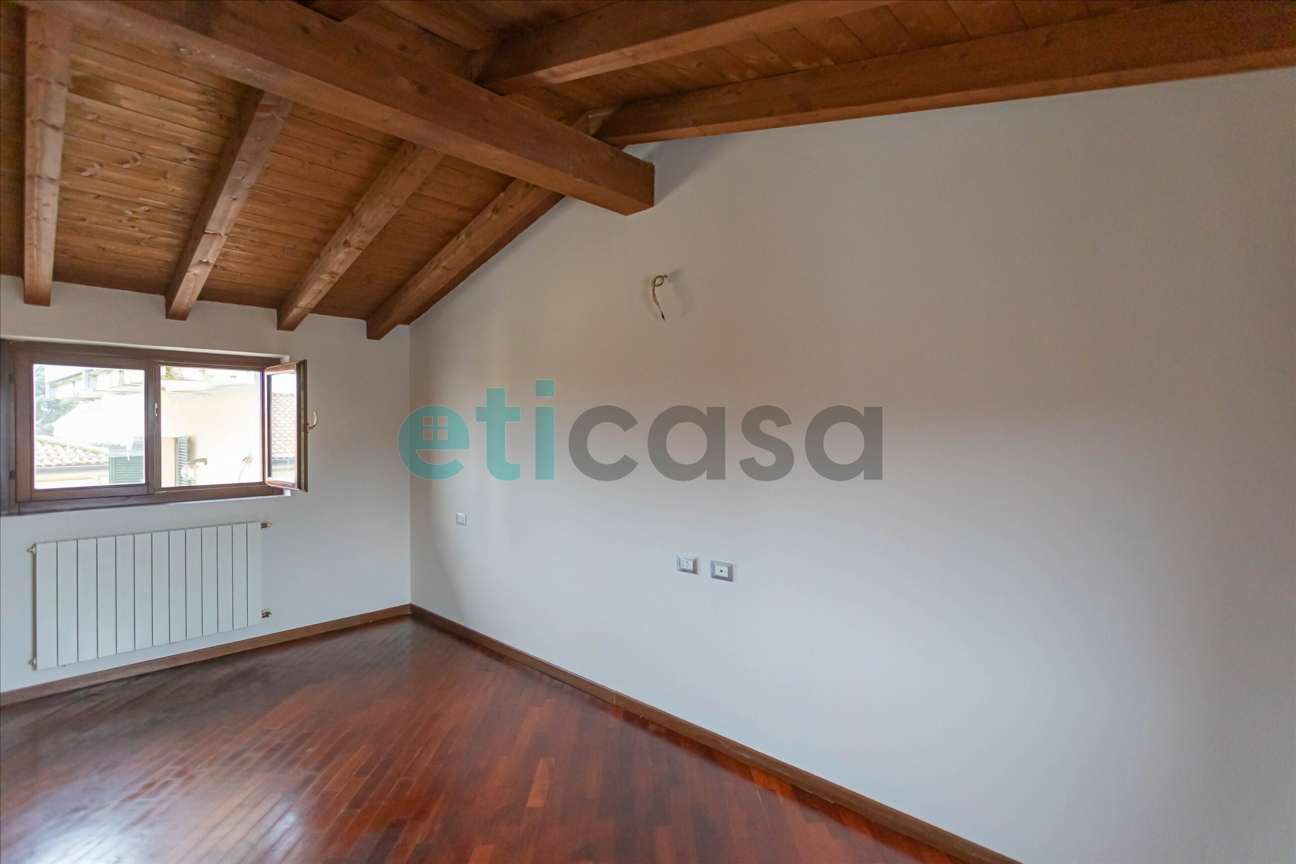 L’ingresso conduce a una cucina abitabile di generose dimensioni, con accesso al balcone, separata dal soggiorno, luminoso e ben proporzionato. Il bagno è finestrato, con vasca da bagno. La camera da letto matrimoniale, ampia e confortevole, è impreziosita da pavimento in parquet e soffitto con travi a vista, che donano calore e carattere all’ambiente.