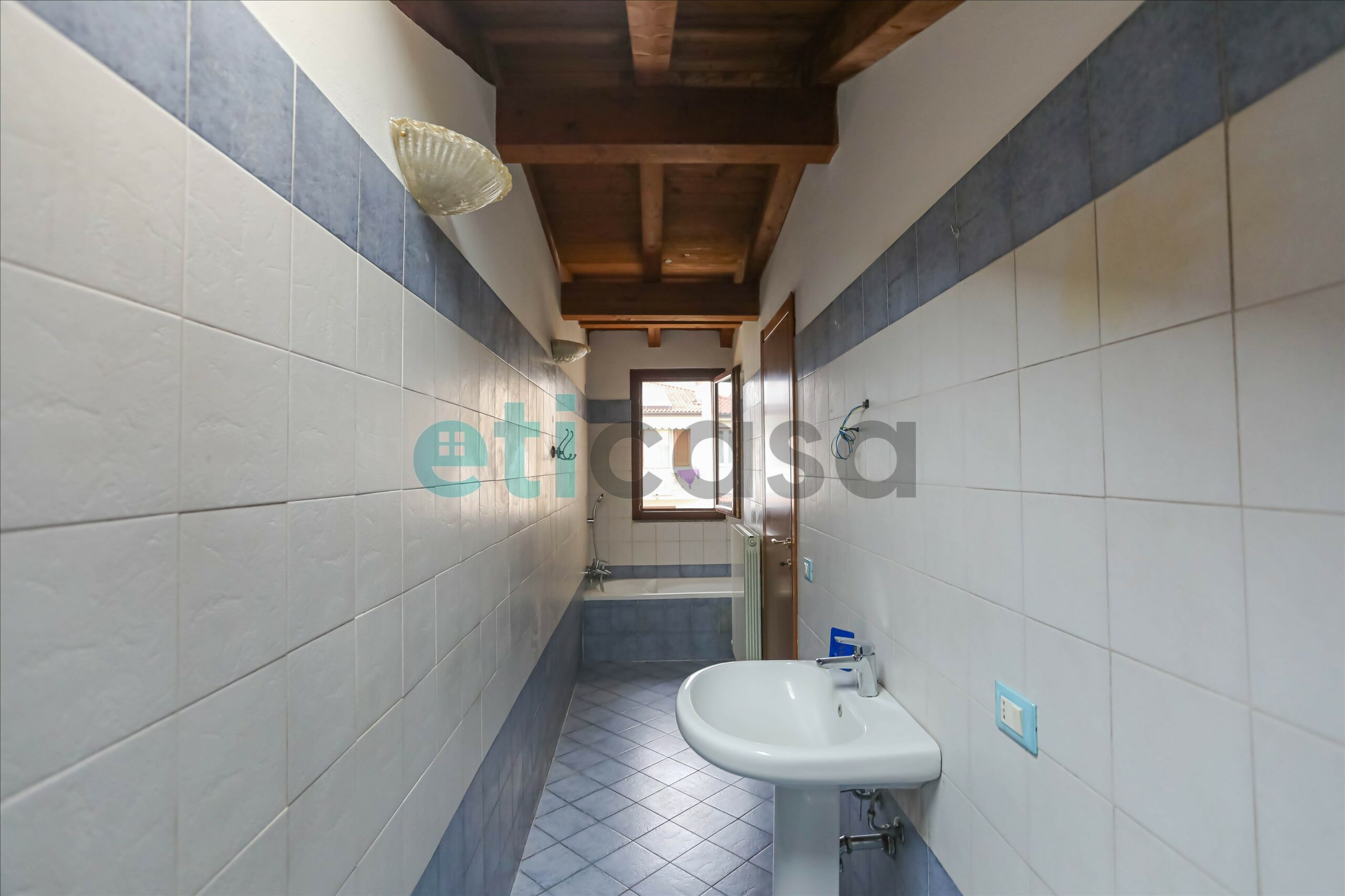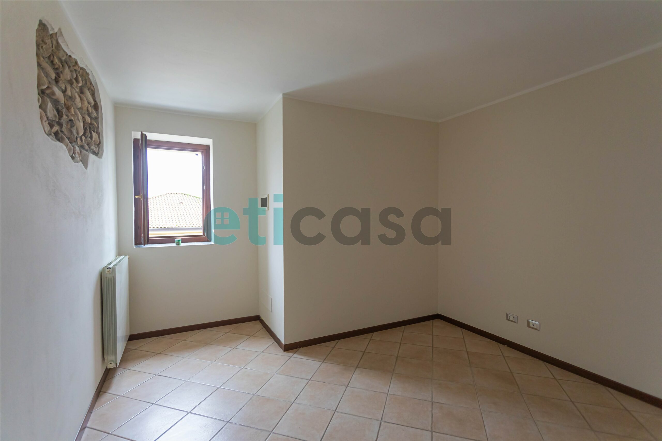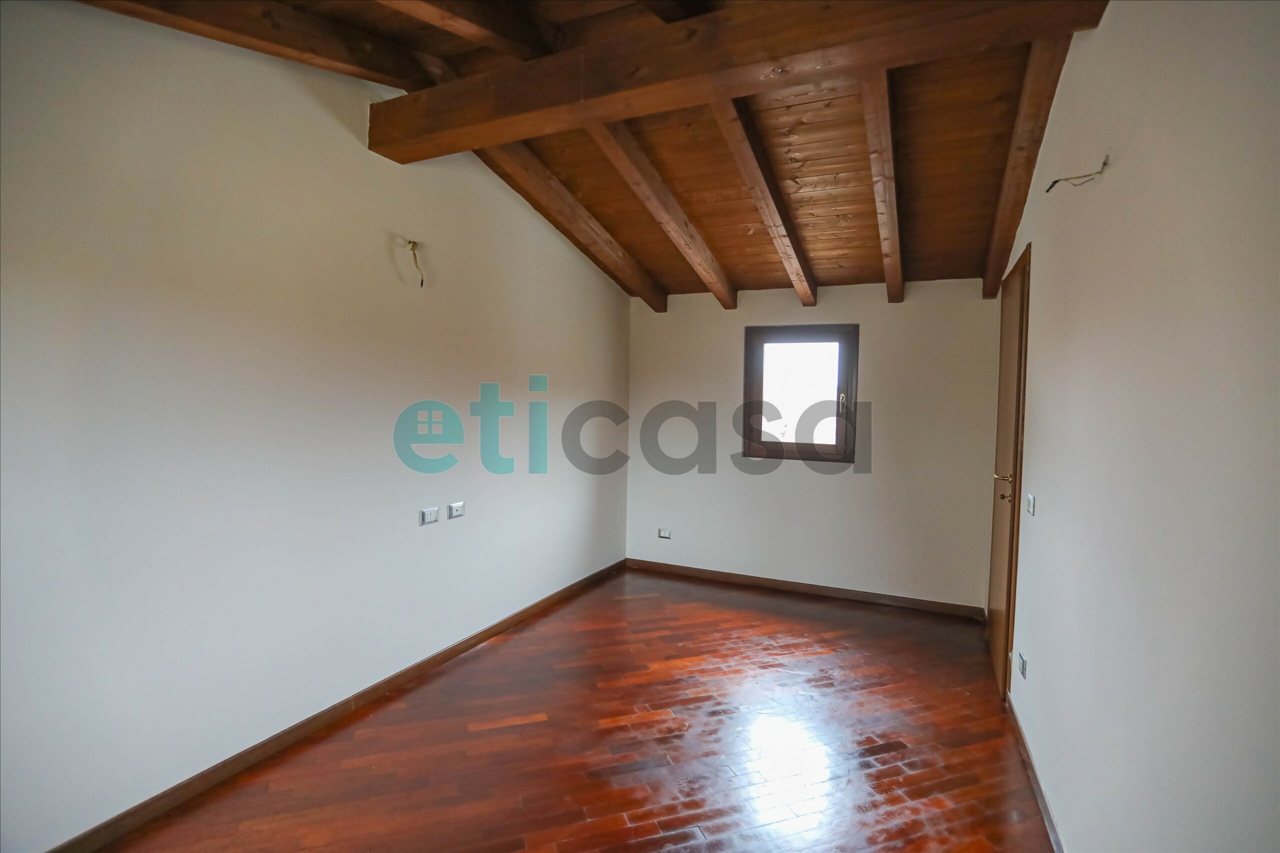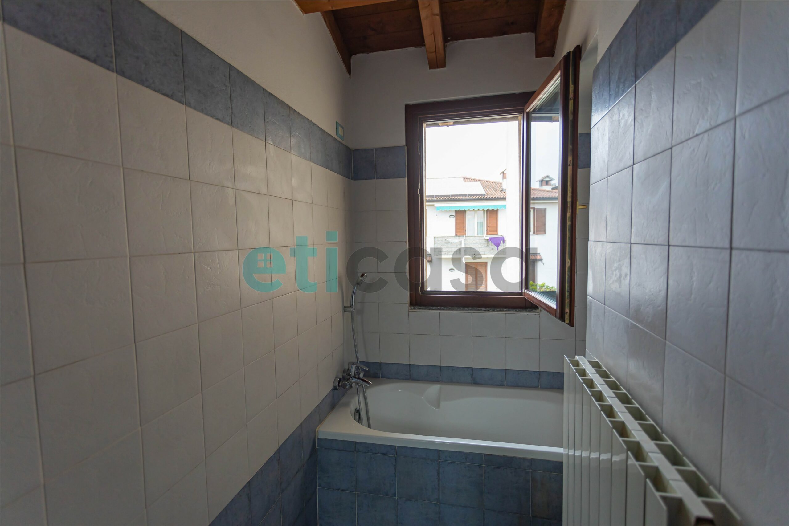 L’ingresso conduce a una cucina abitabile di generose dimensioni, con accesso al balcone, separata dal soggiorno, luminoso e ben proporzionato. Il bagno è finestrato, con vasca da bagno. La camera da letto matrimoniale, ampia e confortevole, è impreziosita da pavimento in parquet e soffitto con travi a vista, che donano calore e carattere all’ambiente.