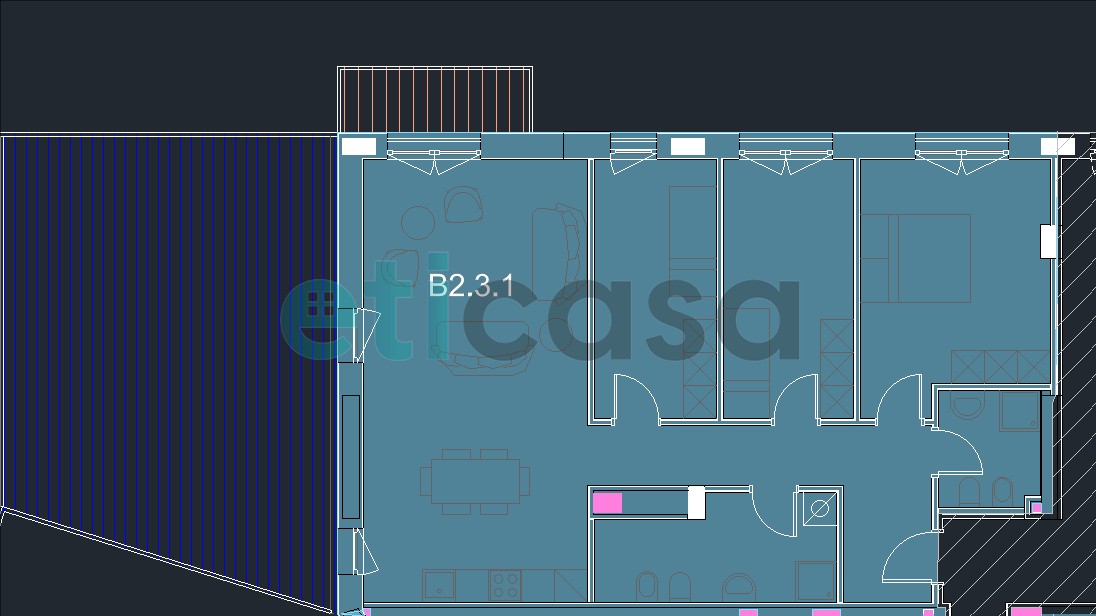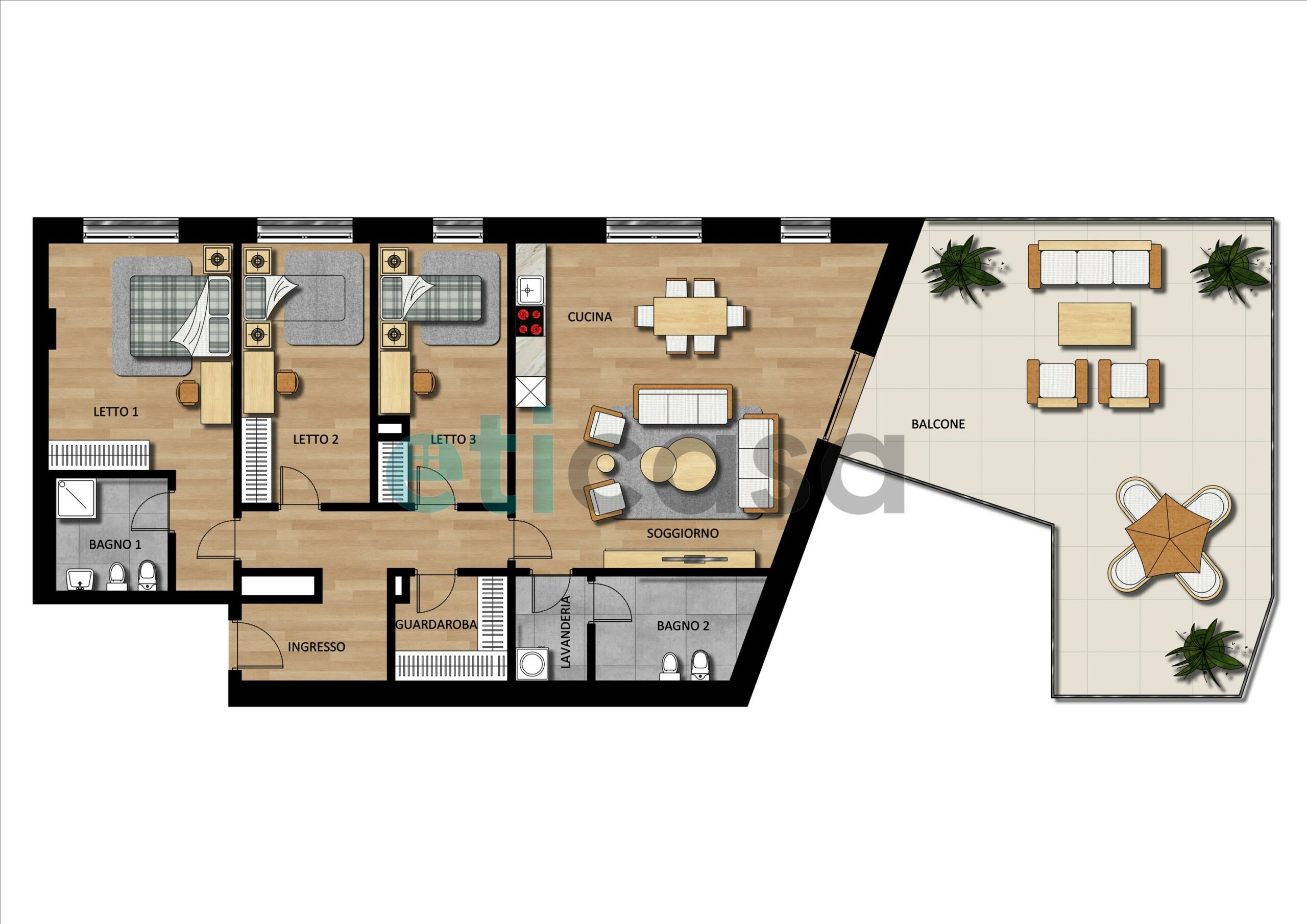 L'immobile si sviluppa al terzo piano. Soggiorno con cucina a vista ed un'ampia terrazza. Tre camere di cui una matrimoniale e due singole, due bagni e ripostiglio.