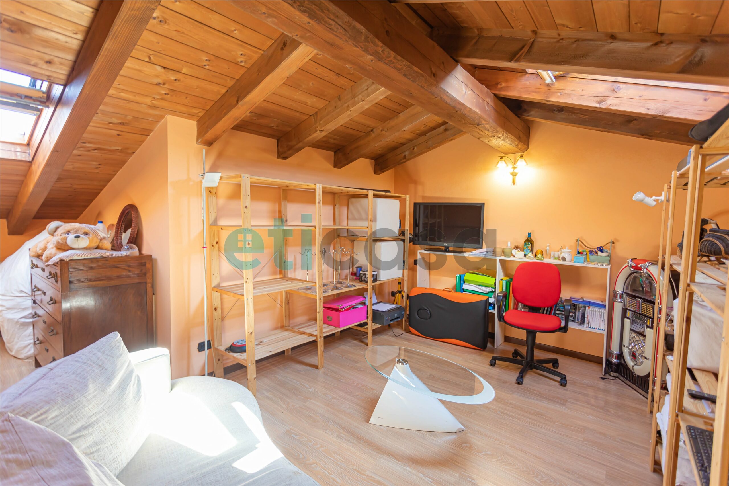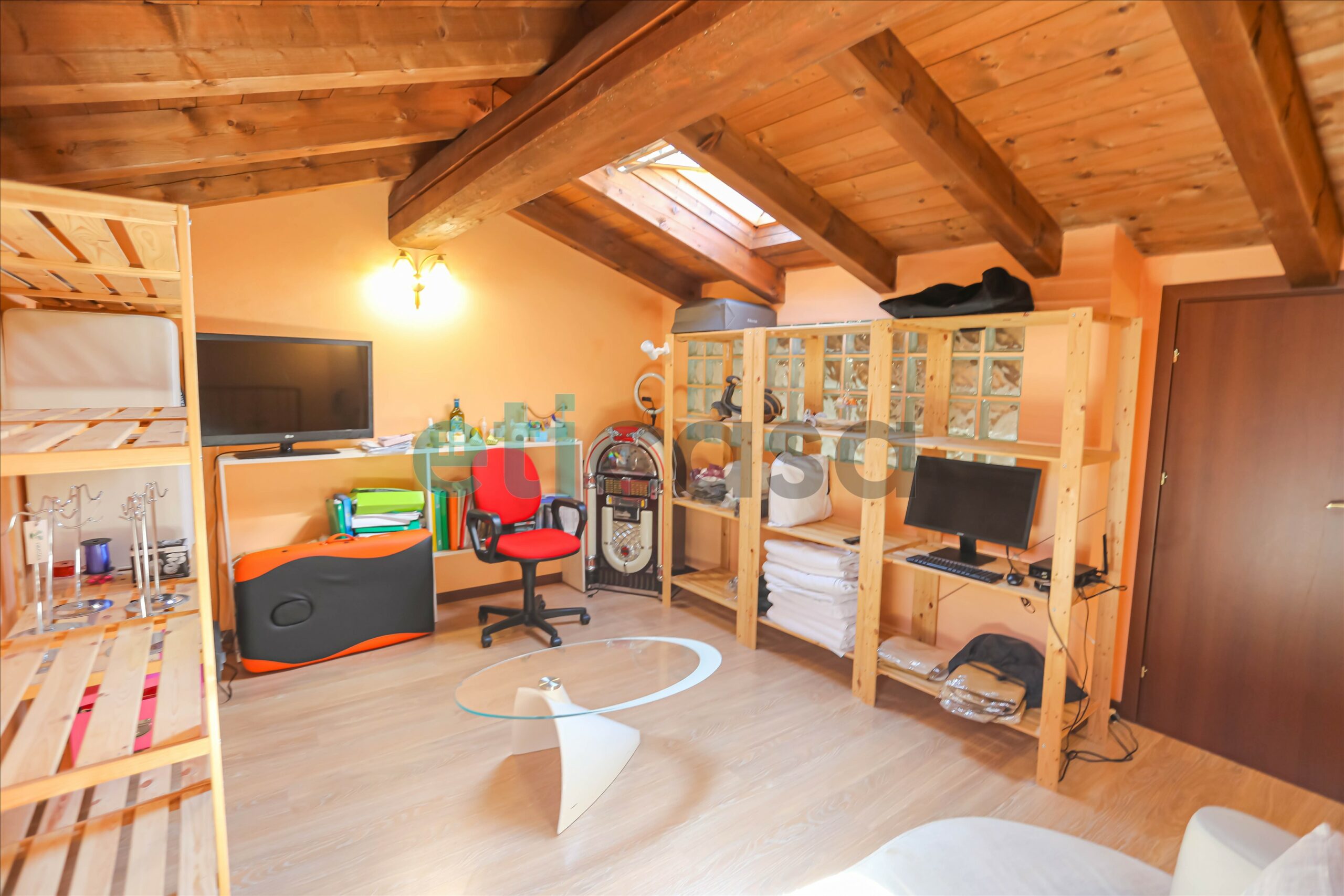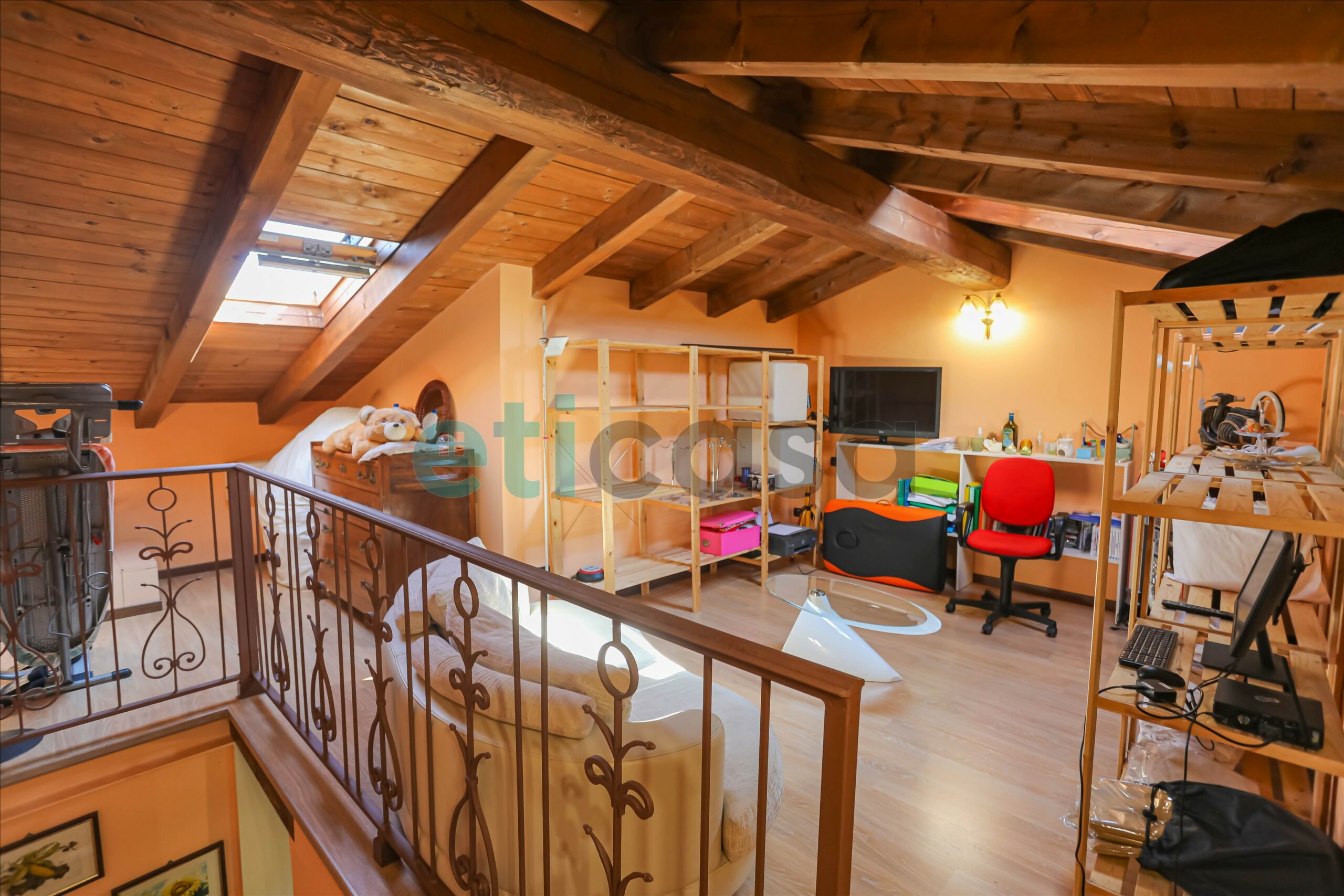 🌟 Una comoda scala in legno porta alla mansarda open space, versatile e ideale come studio, zona hobby o area relax, con annesso ripostiglio.