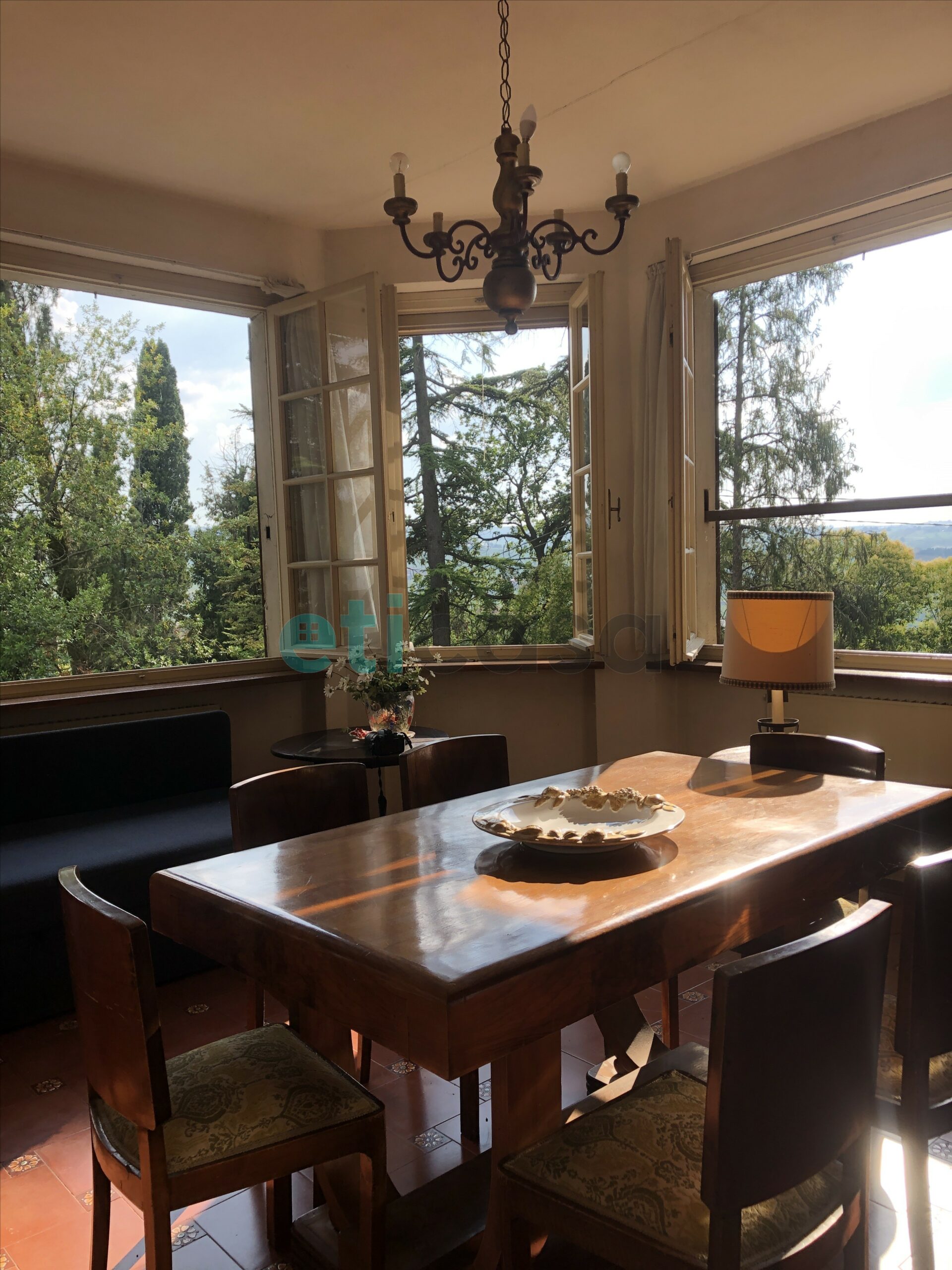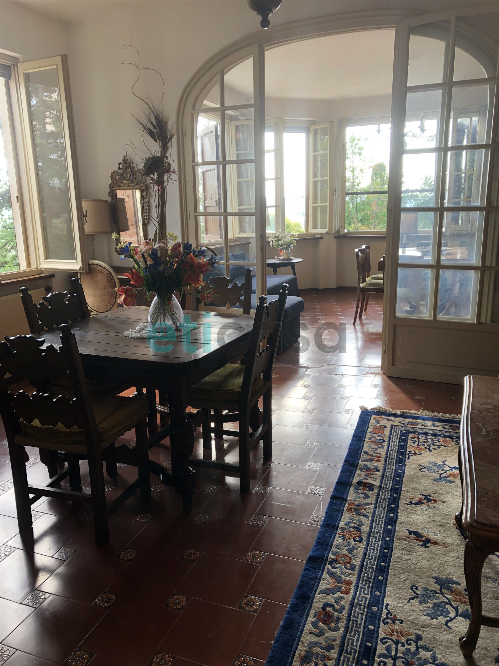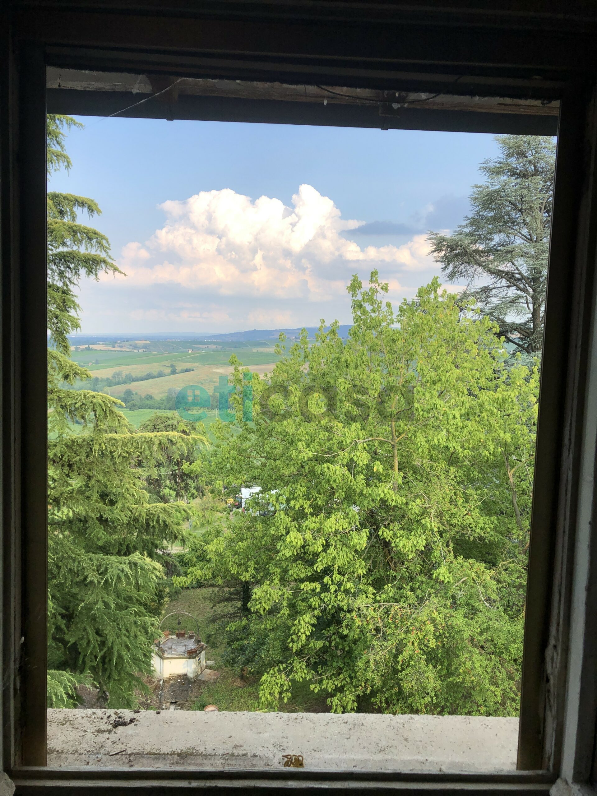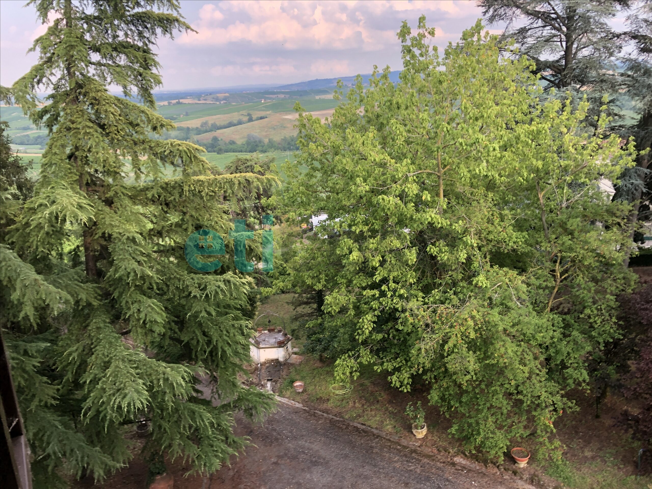 L’edificio, nato come antica posta di cavalli, conserva un’aura storica che dialoga con gli oltre 700 mq di superficie distribuiti su quattro livelli. Intorno, più di 5.600 mq di parco con alberi imponenti e un punto panoramico naturale che domina la valle.