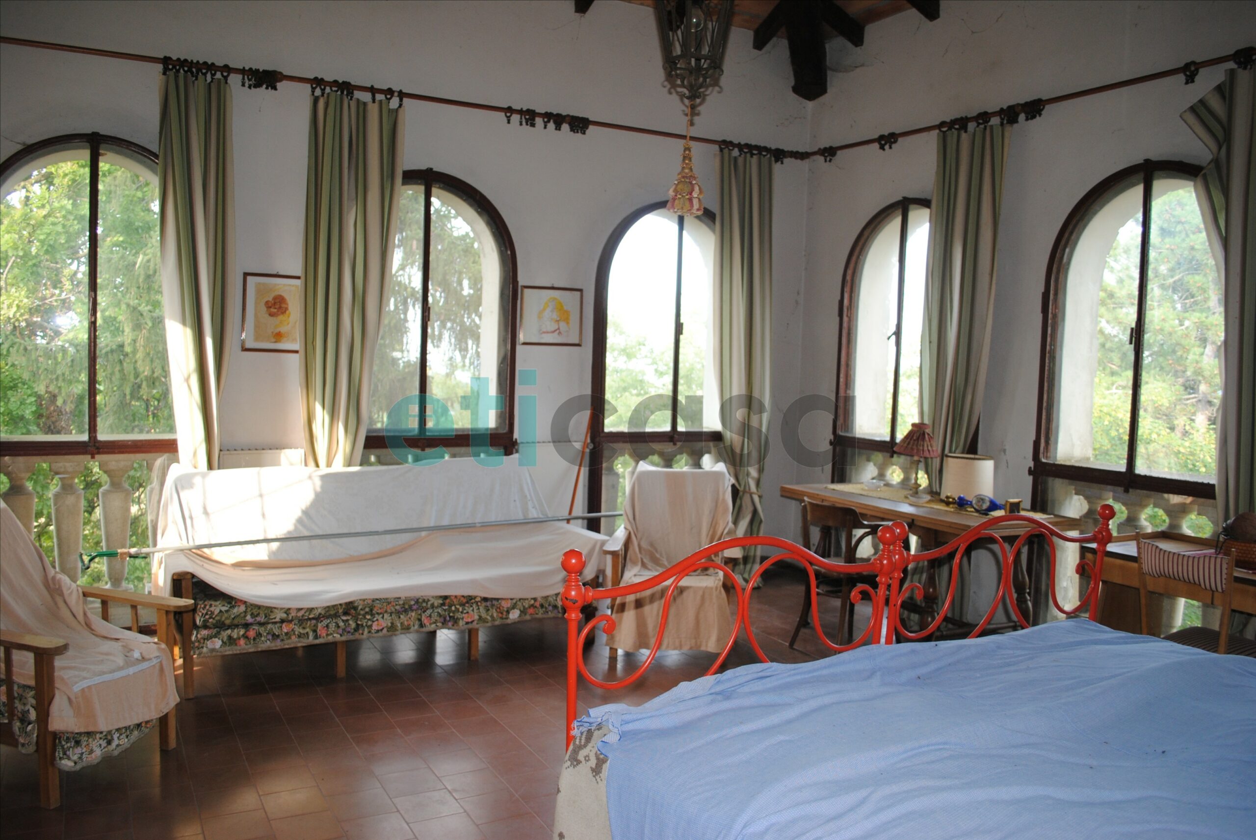 Ai livelli superiori, raggiungibili tramite una scala in legno, la villa offre diverse soluzioni abitative: